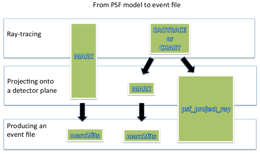 A schematic view of the PSF modeling paths: while MARX can be used both for ray tracing and projecting onto a detector-specific plane, the rays produced by SAOTrace or ChaRT need an extra step to be projected on a detector-specific plane (via MARX) or on a semi-infinite detector-plane (psf_project_ray). The psf_project_ray tool produces an events file as output, while the marx2fits routine should be used after running a MARX simulation to obtain an events file.