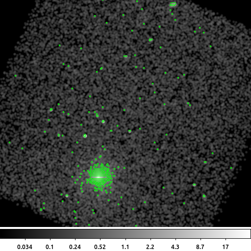 Finally, dmimgblob is used to identify groups of pixels above the threshold. In this example, we selected thresh=0.1 which is 0.1 counts/pixel above the estimated background.