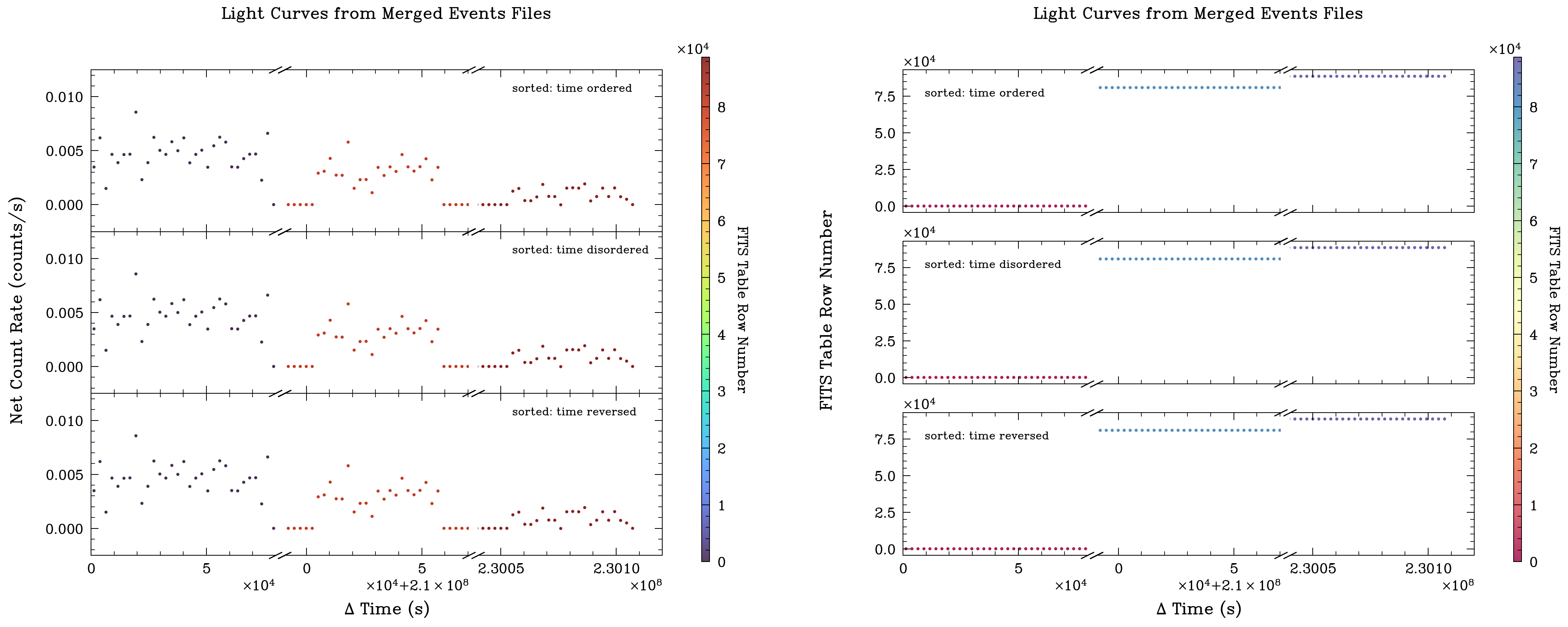 The merging order of events files does not affect the resulting extracted light curve. The left hand plots are the light curves, as net count rate as a function of time and the right hand side plots are the time stamped, extracted light curve row number (array index number). The upper plots are extracted from events files merged in time order while the lower plots are extracted from events files merged in time-reverse. The middle plots are from light curves extracted events files unordered in time. Take note of the zero-valued time bins that are included for the time gaps between observations. The color bar represents the FITS light curve table row of the plotted data set.