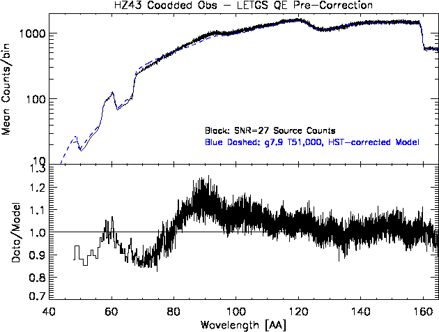 - LETGS QE pre-correction (vN0010): The fit and residuals to co-added spectra for HZ43 taken since launch, with the previous HRC-S QE (version N0010) in CalDB.