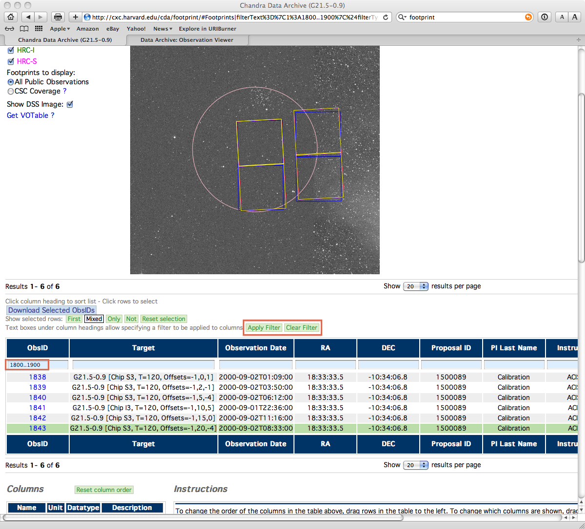 After entering 1800..1900 into the text box below the ObsId header, the Apply Filter box/button will apply the filter (the red rectangles highlight both areas of the screen). For this example the filter restricts the results to 6 entries. The 1843 line has been selected, so it is shown as the yellow outline in the figure and with a green background in the table.