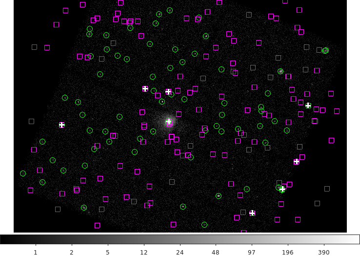 The results from doing a cross match of our source list with the 2MASS Point Source catalog (white crosses) overlaid with the original image, Chandra sources (small green boxes), and 2MASS sources (magenta circles)