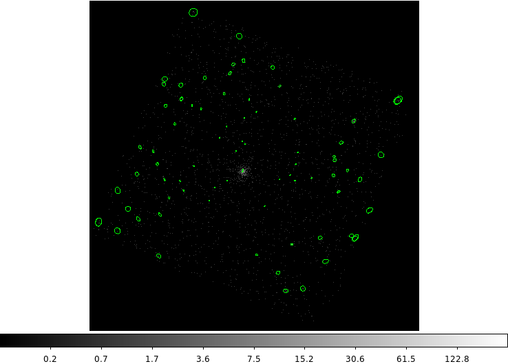 The resulting image, Figure 6, has holes where the sources used to be. The Obtain and Fit a Radial Profile thread illustrates another case in which you might use this syntax (see the Removing Contaminating Point Sources section).