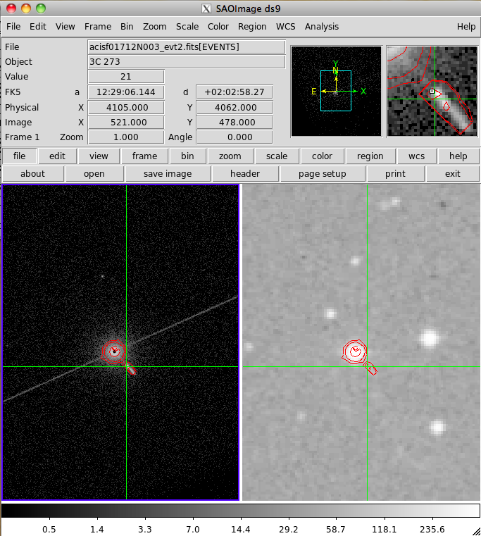 The "Analysis" menu has several features which are useful in the analysis of Chandra data. The following examples illustrate how to apply contours, retrieve Digital Sky Survey data, perform comparative analysis of the two datasets, and define custom analysis functions. There is information on each of the commands used in these examples in the ds9 manual: