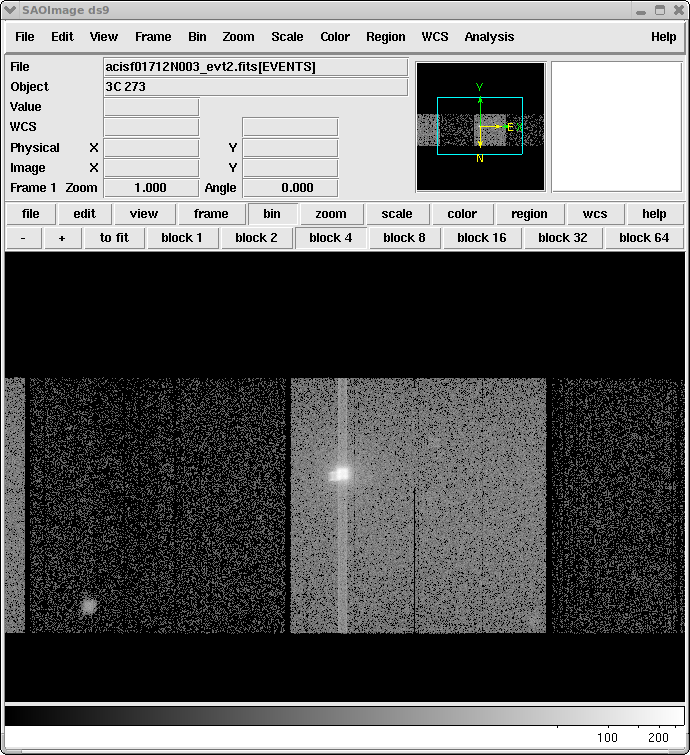 The imager will display a 1k x 1k array of pixels by default (this may be changed in the preferences). The typical Chandra image will need to be binned to see the entire field of view. Using the "Bin" button or menu, try a binning factor of 16. If the Scale is also set to "Log", the image should look like Figure 1.