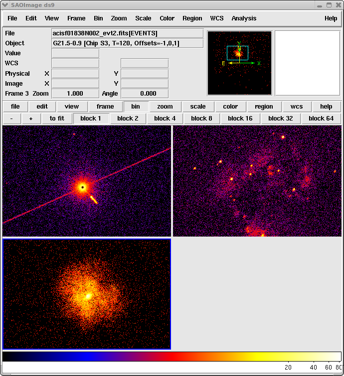 unix% ds9 acisf01712N005_evt2.fits -cmap b -scale log ../../315/primary/acisf00315N004_evt2.fits \ -cmap b -scale log /data/1838/primary/acisf01838N004_evt2.fits -cmap b -scale log &Notice that the pathnames may be relative or absolute. Issuing this command created Figure 3.