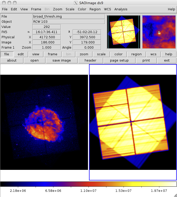 unix% ds9 -scale log -smooth -cmap b rcw103/broad_thresh.img rcw103/broad_thresh.expmap -scale linear