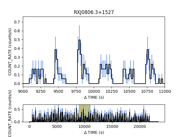 Light curve for RXJ0806.3+1527 binned at 20sec resolution. The top plot is a zoomed in view of the highlighted part of the full lightcurve shown in the bottom plot. The python commands to create the plot using matplotlib are shown below: