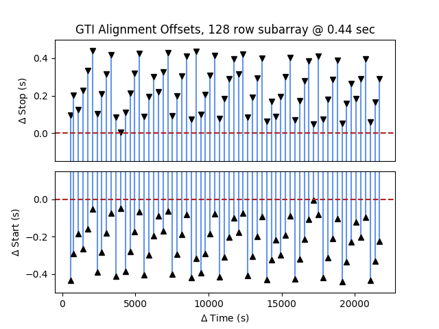 Figure 8 shows a comparison of the GTI START and STOP times after the aligmnent. Since the frame time is approximately 0.44 seconds, the amount each GTI is shifted in either side is no more than 0.44 seconds.