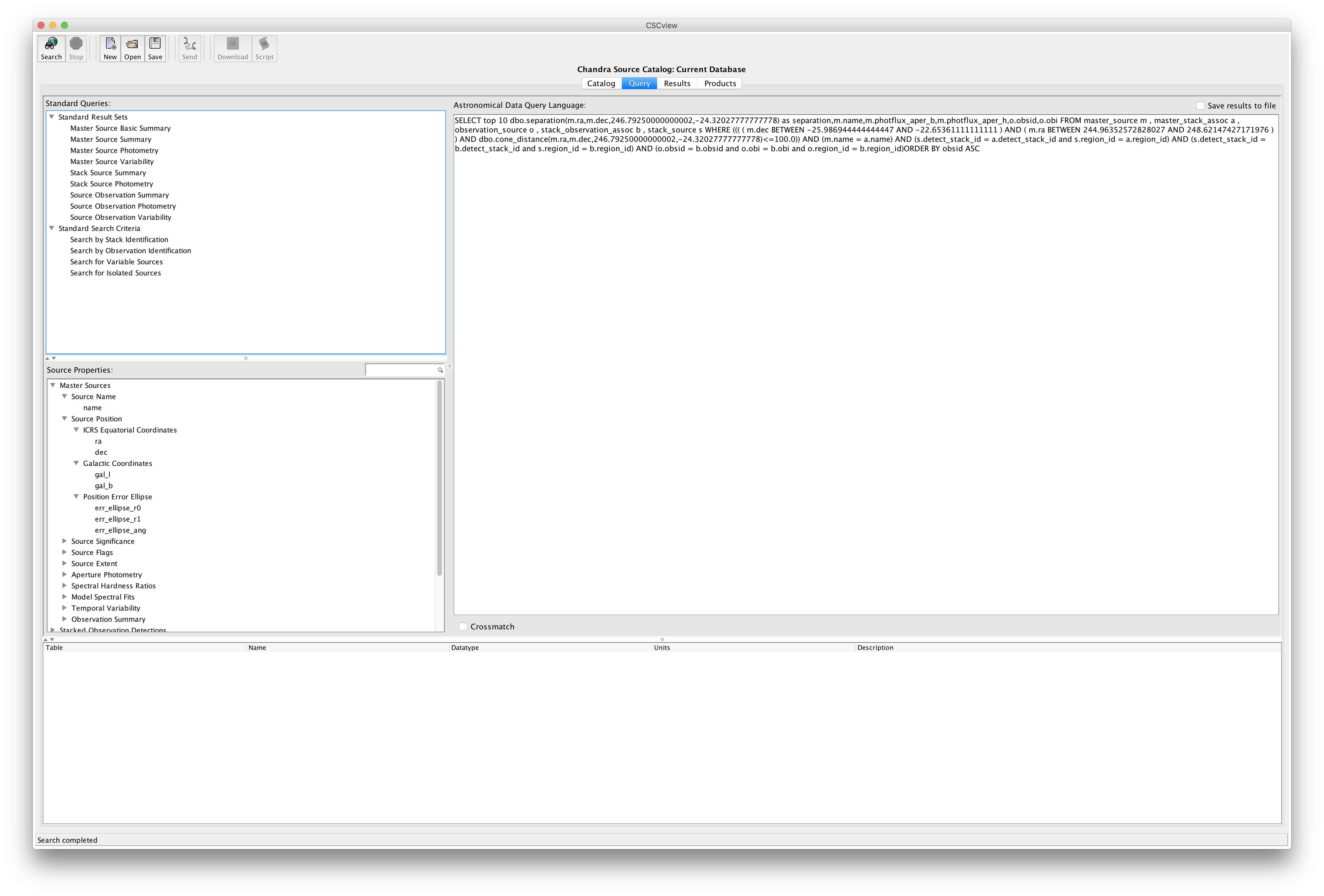 The metadata display at the bottom of the CSCview Query tab lists the name, data type, units, and description of each source property selected in the Source Properties window. For extended, high-level descriptions of each source property included in the catalog, see the "Catalog Columns" page of the CSC website.