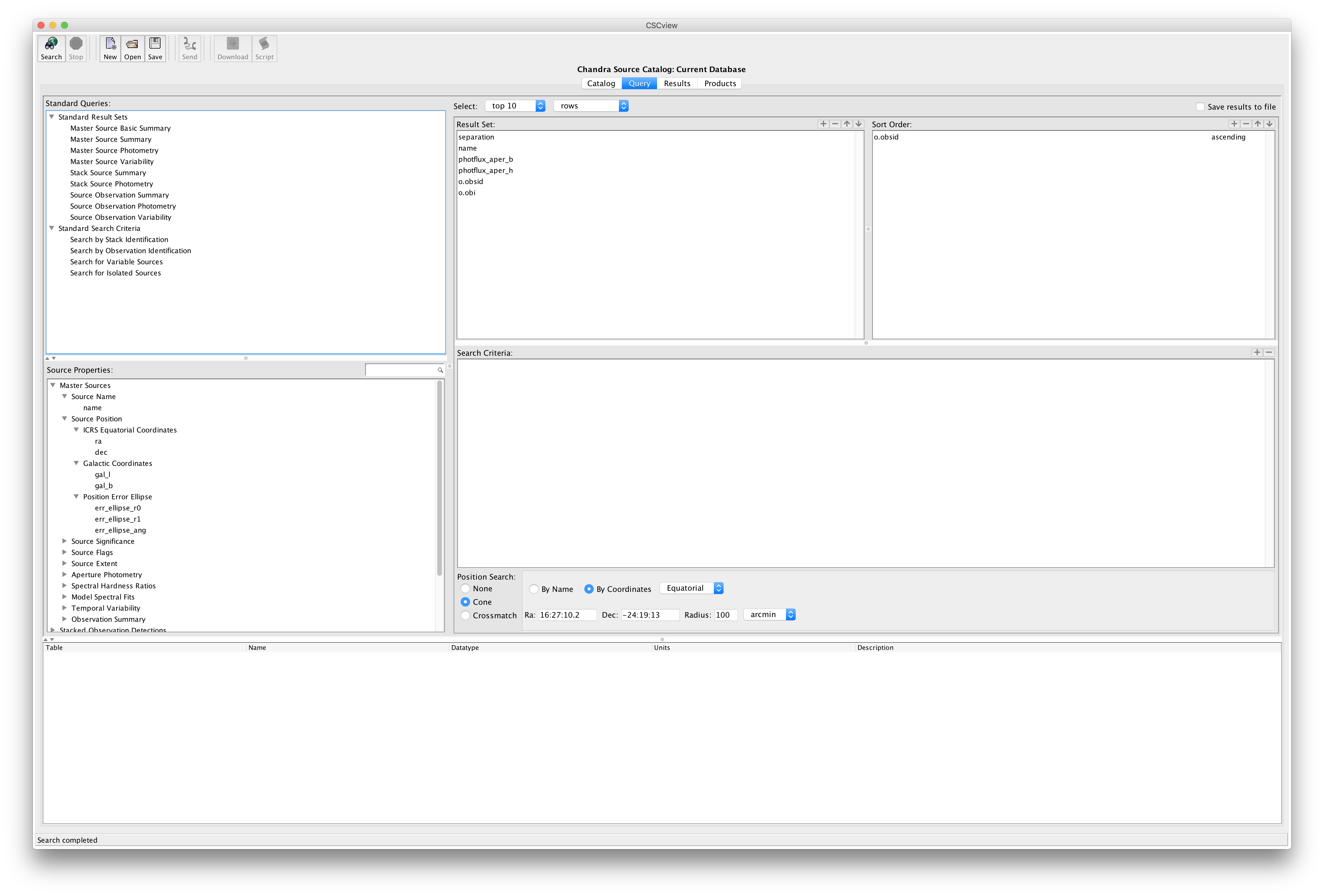 The catalog may be searched in one of two ways in the Query tab of CSCview, using either a "standard query" designed by a CXC scientist, or by building a custom query. In this thread, we consider the example of a custom query which searches for all sources in the catalog which lie within 100 arcminutes of a location in the core of the Rho Ophiuchus molecular cloud.