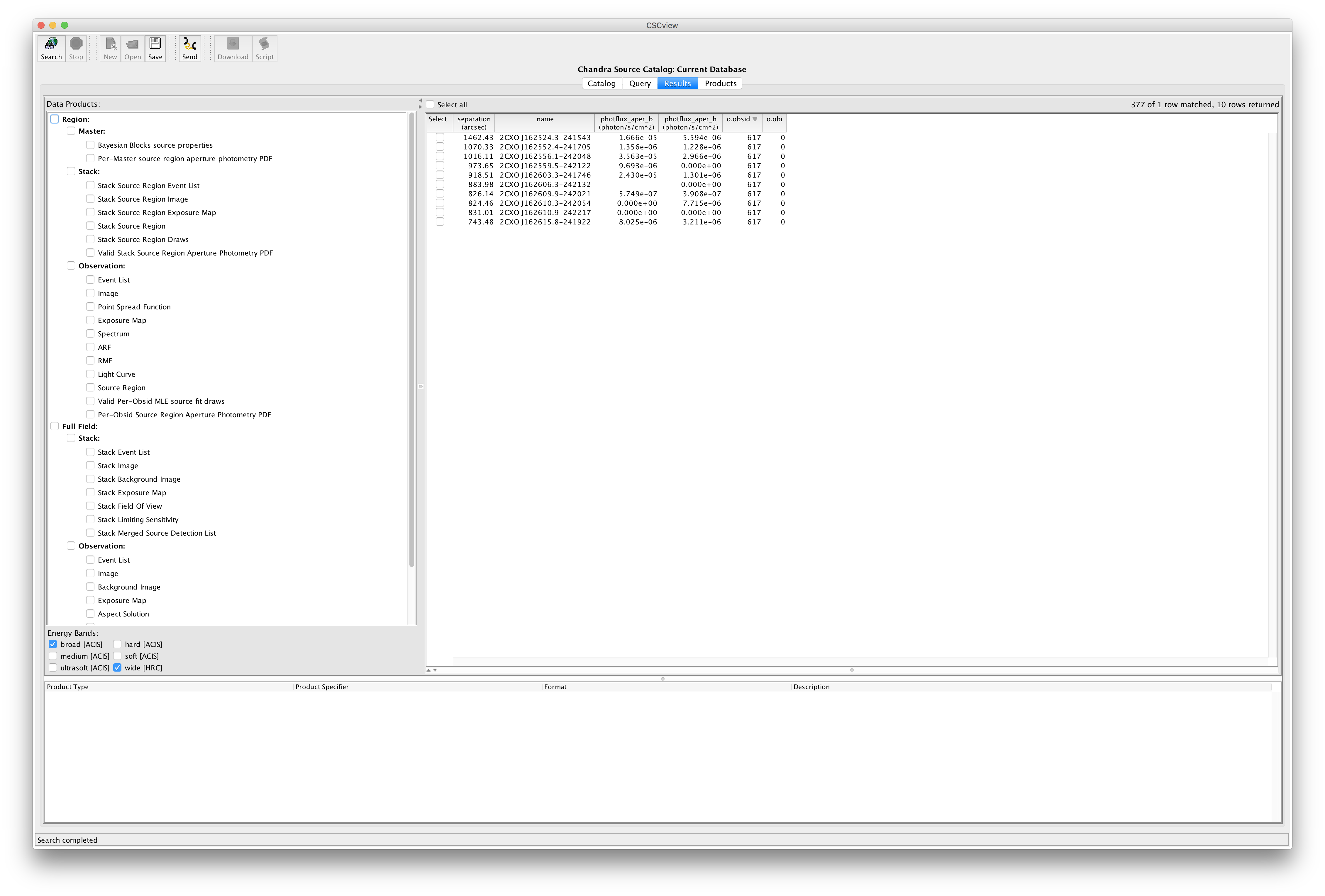 Now that the search conditions for the catalog query have been established, we specify in the Result Set window which master source and/or source observation properties we would like returned for all sources found in the search. (Note that the distance of each source from the specified set of coordinates is automatically added to the result set under the name "separation", in units of arcseconds.) In this example, we would like to know the IDs of the full-field observations in which each source is found, the CXC names of any master source entries linked to those sources, as well as the best estimates of the derived ACIS broad band and hard band aperture source energy fluxes for the sources. To complete the query, we drag the following source properties from the Source Properties window to the Result Set window: the master source 'name', and 'photflux_aper_b' and 'photflux_aper_h' from the "Aperture Photometry→Source Region Aperture Fluxes→Photon Fluxes" category of the Master Source list; and 'obsid' and 'obi' from the "Observation-Specific Information" category of the Source Observations list.