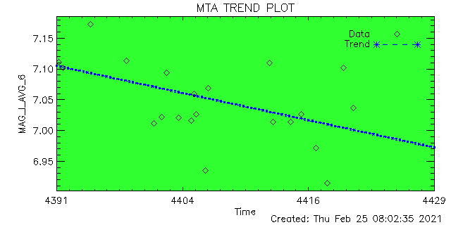 ID | ID String | Magnitude | Data Quality (%) | Total Data | Average | Min | Max | Good | Marginal | Bad | 1 | ACIS-1 | 6.953 | 6.224 | 7.820 | 100 | 0 | 0 | 26 | 2 | ACIS-2 | 6.842 | 6.222 | 7.179 | 100 | 0 | 0 | 30 | 3 | ACIS-3 | 0.000 | 0.000 | 0.000 | 0 | 0 | 0 | 0 | 4 | ACIS-4 | 6.912 | 6.325 | 7.243 | 100 | 0 | 0 | 34 | 5 | ACIS-5 | 6.956 | 6.444 | 7.341 | 100 | 0 | 0 | 42 | 6 | ACIS-6 | 7.045 | 5.528 | 7.447 | 100 | 0 | 0 | 21 | 7 | HRC-I-1 | 0.000 | 0.000 | 0.000 | 0 | 0 | 0 | 0 | 8 | HRC-I-2 | 0.000 | 0.000 | 0.000 | 0 | 0 | 0 | 0 | 9 | HRC-I-3 | 0.000 | 0.000 | 0.000 | 0 | 0 | 0 | 0 | 10 | HRC-I-4 | 0.000 | 0.000 | 0.000 | 0 | 0 | 0 | 0 | 11 | HRC-S-1 | 6.834 | 6.778 | 6.843 | 100 | 0 | 0 | 1 | 12 | HRC-S-2 | 6.826 | 6.817 | 6.835 | 100 | 0 | 0 | 1 | 13 | HRC-S-3 | 6.848 | 6.836 | 6.858 | 100 | 0 | 0 | 1 | 14 | HRC-S-4 | 0.000 | 0.000 | 0.000 | 0 | 0 | 0 | 0 |
