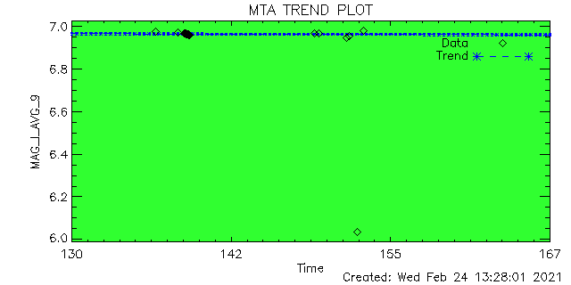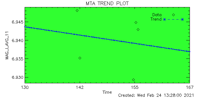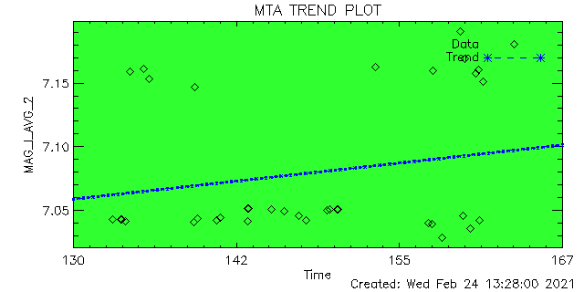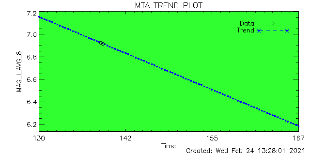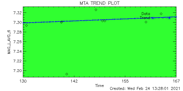 ID | ID String | Magnitude | Data Quality (%) | Total Data | Average | Min | Max | Good | Marginal | Bad | 1 | ACIS-1 | 7.131 | 6.895 | 7.190 | 100 | 0 | 0 | 5 | 2 | ACIS-2 | 7.079 | 6.331 | 7.210 | 100 | 0 | 0 | 37 | 3 | ACIS-3 | 7.304 | 6.784 | 7.371 | 100 | 0 | 0 | 7 | 4 | ACIS-4 | 7.164 | 6.539 | 7.312 | 97 | 0 | 2 | 45 | 5 | ACIS-5 | 7.164 | 5.811 | 7.686 | 100 | 0 | 0 | 45 | 6 | ACIS-6 | 7.290 | 7.031 | 7.349 | 100 | 0 | 0 | 8 | 7 | HRC-I-1 | 6.861 | 5.878 | 7.466 | 100 | 0 | 0 | 29 | 8 | HRC-I-2 | 6.920 | 6.909 | 6.933 | 100 | 0 | 0 | 2 | 9 | HRC-I-3 | 6.932 | 5.716 | 7.562 | 100 | 0 | 0 | 29 | 10 | HRC-I-4 | 6.889 | 5.699 | 6.959 | 100 | 0 | 0 | 29 | 11 | HRC-S-1 | 6.940 | 6.321 | 7.575 | 100 | 0 | 0 | 5 | 12 | HRC-S-2 | 0.000 | 0.000 | 0.000 | 0 | 0 | 0 | 0 | 13 | HRC-S-3 | 6.943 | 6.381 | 7.045 | 100 | 0 | 0 | 5 | 14 | HRC-S-4 | 6.957 | 6.741 | 7.300 | 100 | 0 | 0 | 5 |