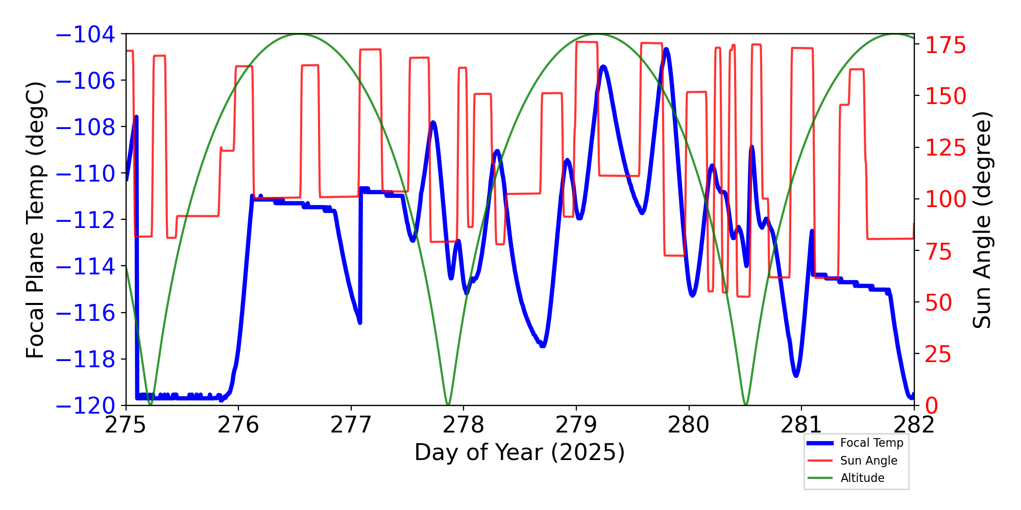 Weekly focal plane temperature with sun angle, earth angle, and altitude overplotted. Sun angle is the solar array angle, that is the angle between the sun and the optical axis (+X axis). The earth angle is the angle between earth and the ACIS radiator (+Z axis). Altitude varies from 34 kkm to 128 kkm.