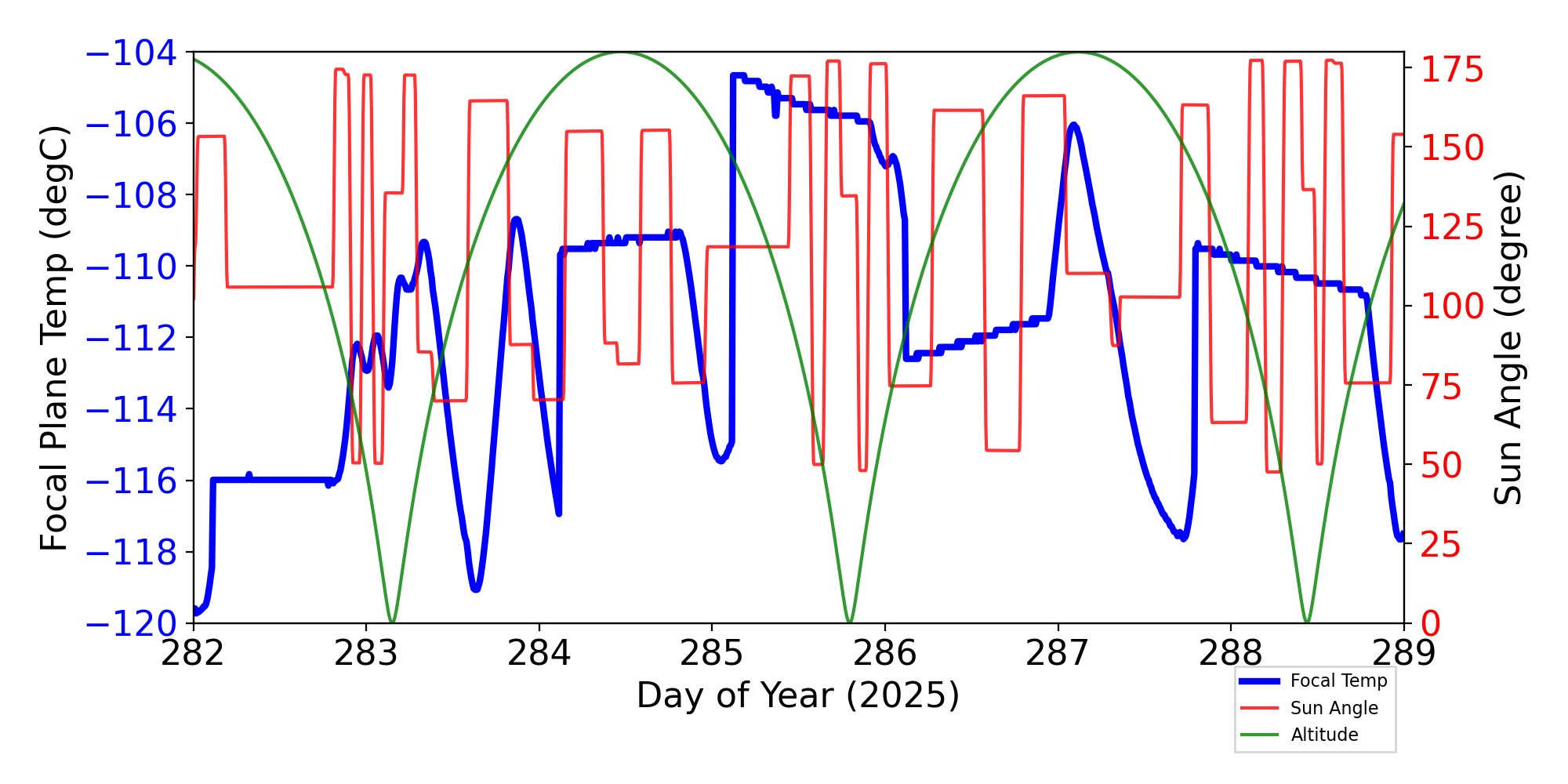 Weekly focal plane temperature with sun angle, earth angle, and altitude overplotted. Sun angle is the solar array angle, that is the angle between the sun and the optical axis (+X axis). The earth angle is the angle between earth and the ACIS radiator (+Z axis). Altitude varies from 34 kkm to 128 kkm.