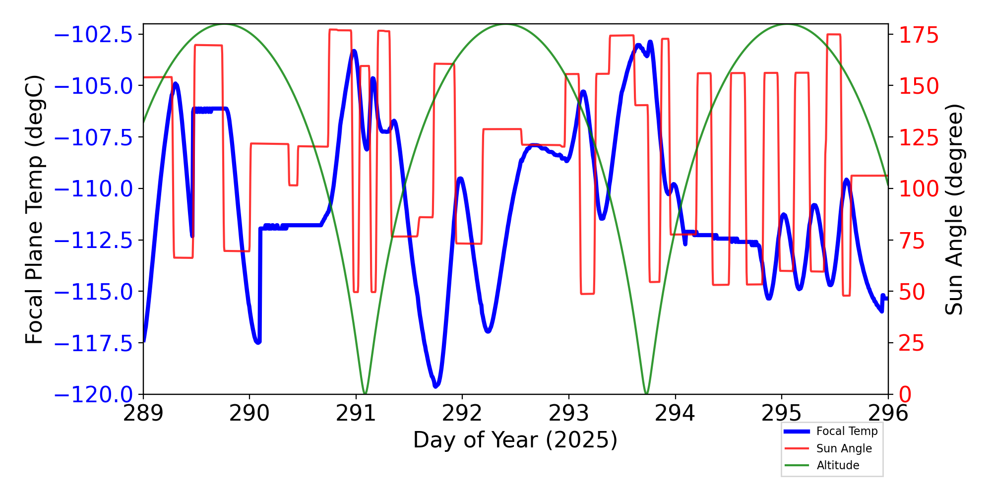 Weekly focal plane temperature with sun angle, earth angle, and altitude overplotted. Sun angle is the solar array angle, that is the angle between the sun and the optical axis (+X axis). The earth angle is the angle between earth and the ACIS radiator (+Z axis). Altitude varies from 34 kkm to 128 kkm.