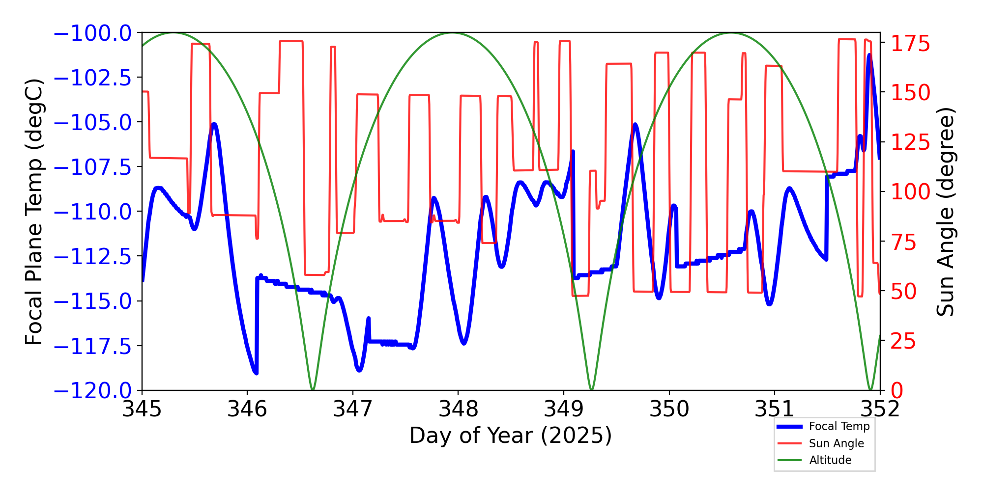 Weekly focal plane temperature with sun angle, earth angle, and altitude overplotted. Sun angle is the solar array angle, that is the angle between the sun and the optical axis (+X axis). The earth angle is the angle between earth and the ACIS radiator (+Z axis). Altitude varies from 34 kkm to 128 kkm.