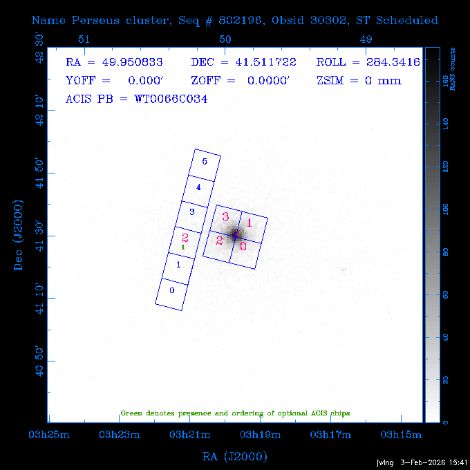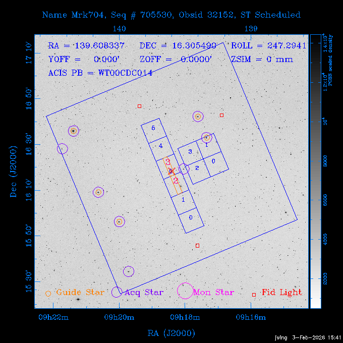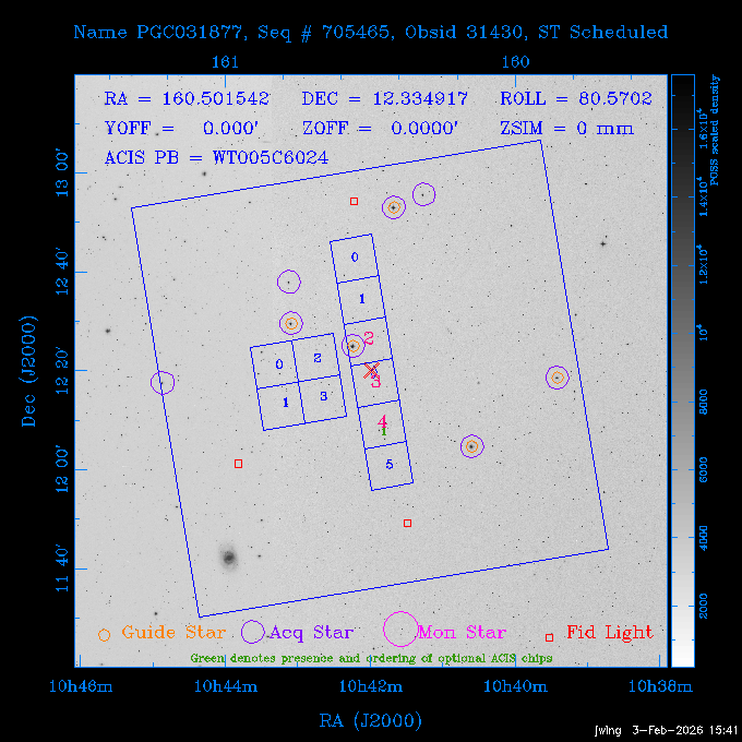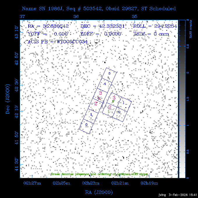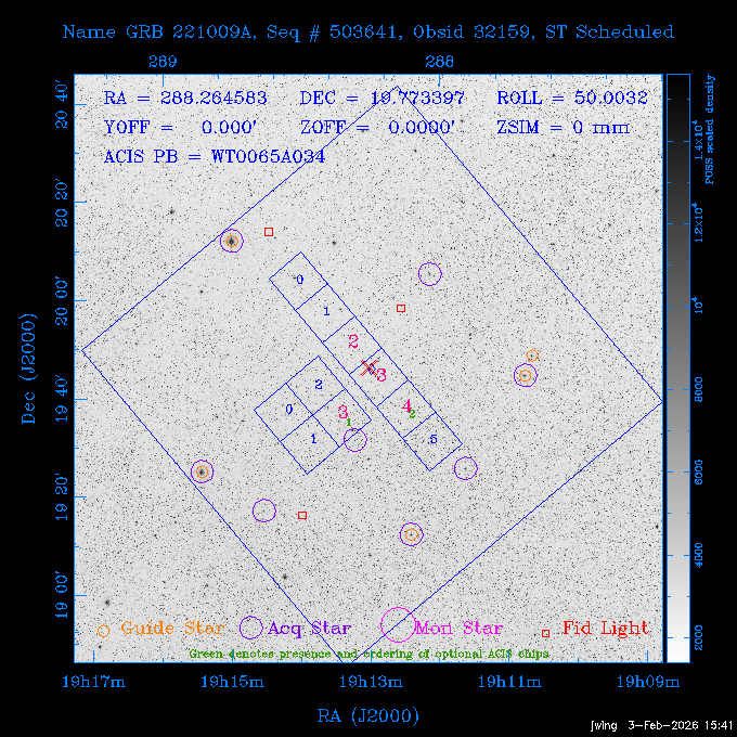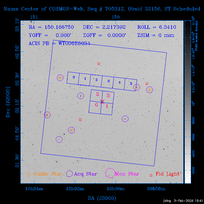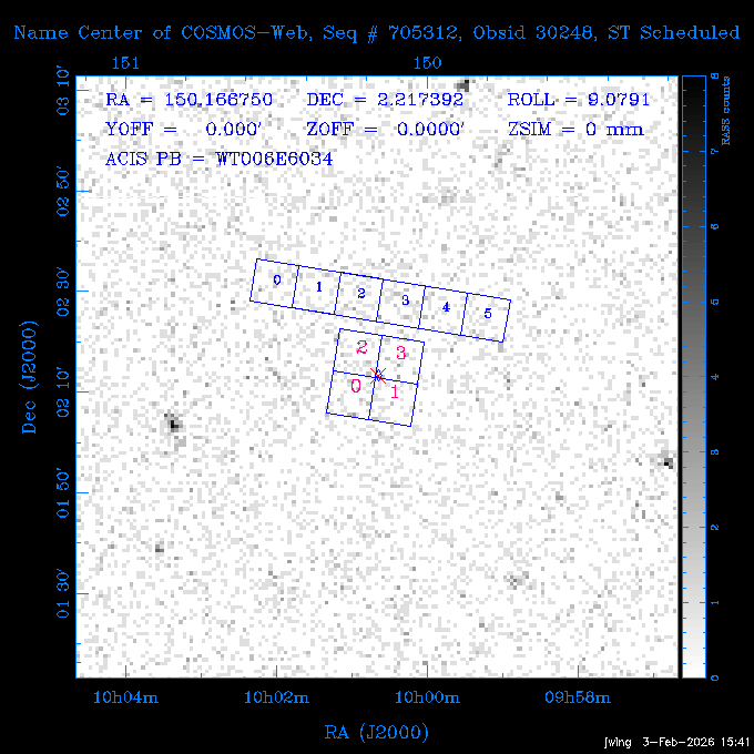 Seq # NB ObsID Constr. Target Start Time SI Grat Active Chips RA Dec Roll Pitch Slew Overlays ------ --- ----- ------- -------------------- --------------------- ----- ------ ---- ----------------- -------- -------- ------ ------ ------ ------------- 705269 29981 0 BOSS1348 2026:033:00:28:45.923 15.0 ACIS-I NONE I0,I1,I2,I3 207.0600 23.9800 80.88 113.09 179.88 dss pspc rass 705427 P1 31280 0 SDSS J101639.87+1940 2026:033:05:05:14.460 12.7 ACIS-S NONE S2,S3 154.1661 19.6801 95.63 162.06 49.38 dss pspc rass 503548 TOO 29833 2 SN2025sei 2026:033:09:15:04.518 11.0 ACIS-S NONE S2,S3 267.2476 25.4958 53.19 63.37 102.00 dss pspc rass 705526 CCT 32137 0 SDSSJ093404.74+19561 2026:033:12:58:07.871 10.0 ACIS-S NONE S2,S3 143.5198 19.9382 119.99 172.06 109.00 dss pspc rass 503548 TOO 32111 2 SN2025sei 2026:033:16:24:31.354 10.2 ACIS-S NONE S2,S3 267.2476 25.4958 53.48 63.53 109.01 dss pspc rass 802196 30296 0 Perseus cluster 2026:033:19:53:27.226 20.0 ACIS-I NONE I0,I1,I2,I3,S2 49.9508 41.5117 280.30 103.83 105.44 dss pspc rass 802203 30393 0 ZwCl 0857.9+2107 2026:034:01:59:53.794 10.0 ACIS-S NONE S1,S2,S3 135.1535 20.8945 195.01 175.63 79.24 dss pspc rass ---- 41752 CAL-ER (PER01) 2026:034:05:01:09.247 3.0 -- -- 136.1000 20.0000 186.13 176.62 8.64 ---- 41751 CAL-ER (PER05) 2026:034:09:00:00.000 3.0 -- -- 341.6000 26.4000 327.78 49.35 128.39 ---- 41750 CAL-ER (PER02) 2026:034:11:30:00.000 5.8 -- -- 30.0000 43.0000 293.36 89.56 42.75 ---- 41749 CAL-ER (CAL01) 2026:034:15:10:00.000 1.0 -- -- 136.0000 20.0000 193.89 176.41 91.21 ---- 41748 CAL-ER (PER06) 2026:034:16:15:00.000 1.0 -- -- 141.0000 15.0000 68.42 175.82 124.08 503537 30127 0 SNR G1.9+0.3 2026:034:17:22:44.410 14.6 ACIS-S NONE I2,I3,S2,S3 267.1875 -27.1667 92.37 47.14 128.74 dss pspc rass 705468 P1 31433 0 PG 1004+130 2026:034:22:07:51.189 11.0 ACIS-S NONE S2,S3 151.8588 12.8156 73.76 165.36 118.26 dss pspc rass 503537 32142 0 SNR G1.9+0.3 2026:035:01:52:58.004 14.0 ACIS-S NONE I2,I3,S2,S3 267.1875 -27.1667 92.30 47.50 118.26 dss pspc rass 705479 P1 31444 0 ESO324-008 2026:035:06:14:21.384 6.0 ACIS-S NONE S2,S3 200.2249 -39.2787 59.75 99.36 56.50 dss pspc rass 201862 31048 2 Orion Nebula snapsho 2026:035:08:36:04.373 12.0 ACIS-I NONE I0,I1,I2,I3 83.8196 -5.3792 293.24 122.49 117.97 dss pspc rass 201863 31049 2 Orion Nebula snapsho 2026:035:12:04:34.373 12.0 ACIS-I NONE I0,I1,I2,I3 83.8196 -5.3792 293.14 122.37 0.10 dss pspc rass 802196 30314 0 Perseus cluster 2026:035:15:53:32.781 17.0 ACIS-I NONE I0,I1,I2,I3 49.9508 41.5117 281.06 102.12 60.63 dss pspc rass 201864 31050 2 Orion Nebula snapsho 2026:035:21:05:03.990 11.0 ACIS-I NONE I0,I1,I2,I3 83.8196 -5.3792 280.00 122.06 57.09 dss pspc rass 705527 CCT 32138 0 SDSSJ085640.78+10575 2026:036:00:39:02.091 10.0 ACIS-S NONE S2,S3 134.1700 10.9655 322.13 173.43 68.11 dss pspc rass 705305 30232 0 [vD2023]1 2026:036:04:03:43.604 11.5 ACIS-I NONE I0,I1,I2,I3 40.4405 -8.3506 284.98 80.02 101.36 dss pspc rass 802196 30316 0 Perseus cluster 2026:036:07:42:25.970 45.0 ACIS-I NONE I0,I1,I2,I3 49.9508 41.5117 270.01 101.51 51.93 dss pspc rass ---- 41747 CAL-ER (CAL01) 2026:036:20:44:44.627 3.0 -- -- 136.0000 20.0000 216.34 174.87 74.05 ---- 41746 CAL-ER (CAL01) 2026:037:00:15:00.000 3.0 -- -- 341.6000 26.4000 330.27 47.43 127.46 ---- 41745 CAL-ER (PER03) 2026:037:03:59:30.649 5.7 -- -- 30.0000 43.0000 294.67 87.17 42.91 802203 32144 0 ZwCl 0857.9+2107 2026:037:08:53:40.630 16.0 ACIS-S NONE S1,S2,S3 135.1535 20.8945 220.00 173.26 86.37 dss pspc rass 705466 P1 31431 0 PGC101434 2026:037:14:01:59.129 11.0 ACIS-S NONE S2,S3,S4 8.0775 15.0039 300.75 56.60 117.64 dss pspc rass 802203 32145 0 ZwCl 0857.9+2107 2026:037:17:46:55.468 10.0 ACIS-S NONE S1,S2,S3 135.1535 20.8945 221.87 172.94 117.48 dss pspc rass 705466 32149 0 PGC101434 2026:037:21:15:11.919 11.0 ACIS-S NONE S2,S3,S4 8.0775 15.0039 300.84 56.30 117.48 dss pspc rass 802203 30399 0 ZwCl 0857.9+2107 2026:038:01:00:00.592 11.0 ACIS-S NONE S1,S2,S3 135.1535 20.8945 233.00 172.68 116.90 dss pspc rass 705305 32143 0 [vD2023]1 2026:038:04:41:37.288 18.0 ACIS-I NONE I0,I1,I2,I3 40.4405 -8.3506 284.16 78.13 102.50 dss pspc rass 802203 32146 0 ZwCl 0857.9+2107 2026:038:10:19:50.427 14.0 ACIS-S NONE S1,S2,S3 135.1535 20.8945 234.00 172.33 102.24 dss pspc rass 201908 CCT 32140 0 G 132-50 2026:038:14:50:13.254 4.8 ACIS-S NONE S2,S3 15.9179 40.8574 305.46 75.77 96.96 dss pspc rass 901886 30494 0 CMZ Molecular Cloud 2026:038:16:59:39.565 11.6 ACIS-I NONE I0,I1,I2,I3 266.5505 -28.8887 87.21 51.80 152.72 dss pspc rass 802268 CCT 32139 0 RMJ093723.8+125312.3 2026:038:20:56:06.720 11.0 ACIS-I NONE I0,I1,I2,I3 144.3494 12.8868 52.11 176.12 124.29 dss pspc rass 901886 32147 0 CMZ Molecular Cloud 2026:039:00:42:33.820 18.3 ACIS-I NONE I0,I1,I2,I3 266.5505 -28.8887 87.01 52.13 124.28 dss pspc rass 705269 32141 0 BOSS1348 2026:039:06:20:22.458 19.1 ACIS-I NONE I0,I1,I2,I3 207.0600 23.9800 85.08 118.14 77.90 dss pspc rass ---- 41744 CAL-ER (PER07) 2026:039:12:08:42.177 2.0 -- -- 146.1000 14.3000 79.61 175.78 63.62 ---- 41743 CAL-ER (PER08) 2026:039:14:00:00.000 2.0 -- -- 136.0000 20.0000 229.12 172.49 146.69 ---- 41742 CAL-ER (CAL01) 2026:039:15:45:00.000 3.0 -- -- 354.2000 22.5000 316.91 49.01 123.52 ---- 41741 CAL-ER (PER04) 2026:039:19:29:47.109 5.5 -- -- 30.0000 43.0000 295.96 84.82 36.01 ---- 41740 CAL-ER (CAL01) 2026:039:22:00:00.000 1.0 -- -- 136.0000 20.0000 230.14 172.19 87.59 ---- 41739 CAL-ER (CAL01) 2026:039:23:15:00.000 1.0 -- -- 149.0000 13.0000 73.20 173.19 153.43 901886 32148 0 CMZ Molecular Cloud 2026:040:00:49:21.263 7.0 ACIS-I NONE I0,I1,I2,I3 266.5505 -28.8887 92.75 53.12 120.39 dss pspc rass