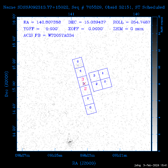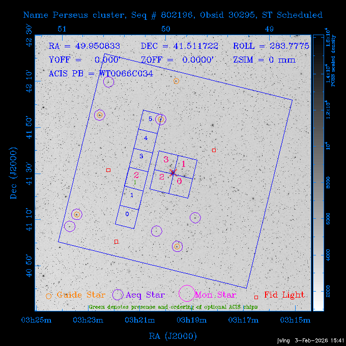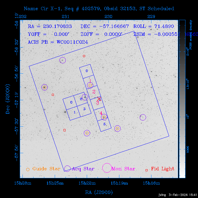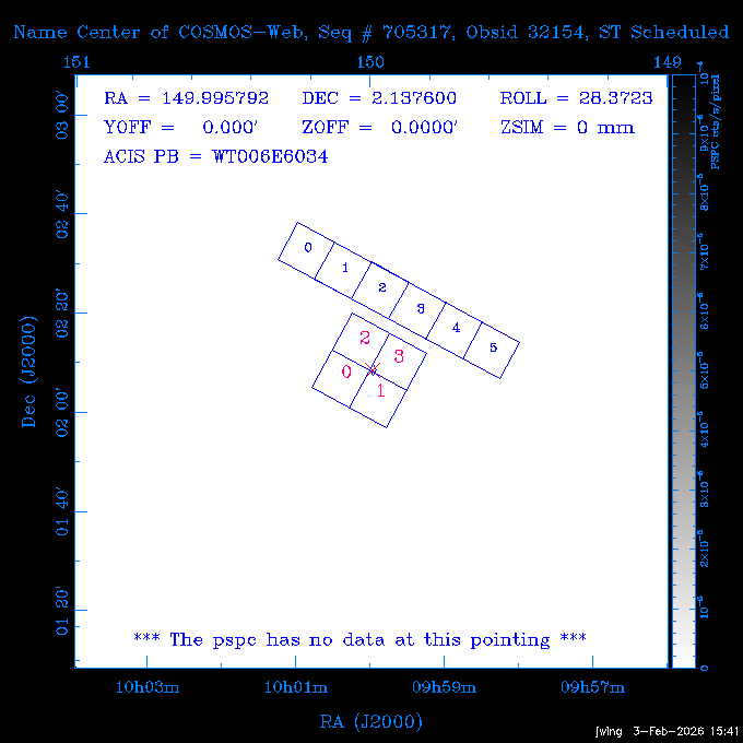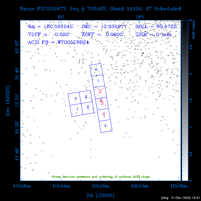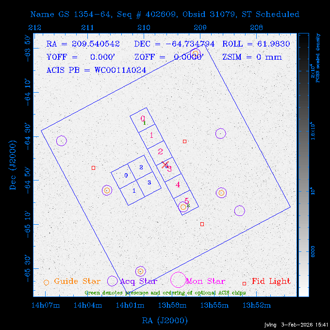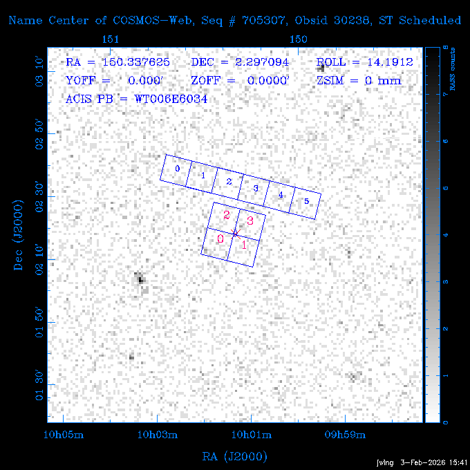Seq # NB ObsID Constr. Target Start Time SI Grat Active Chips RA Dec Roll Pitch Slew Overlays ------ --- ----- ------- -------------------- --------------------- ----- ------ ---- ----------------- -------- -------- ------ ------ ------ ------------- 705269 29981 0 BOSS1348 2026:033:00:28:45.923 15.0 ACIS-I NONE I0,I1,I2,I3 207.0600 23.9800 80.88 113.09 179.88 dss pspc rass 705427 P1 31280 0 SDSS J101639.87+1940 2026:033:05:05:14.460 12.7 ACIS-S NONE S2,S3 154.1661 19.6801 95.63 162.06 49.38 dss pspc rass 503548 TOO 29833 2 SN2025sei 2026:033:09:15:04.518 11.0 ACIS-S NONE S2,S3 267.2476 25.4958 53.19 63.37 102.00 dss pspc rass 705526 CCT 32137 0 SDSSJ093404.74+19561 2026:033:12:58:07.871 10.0 ACIS-S NONE S2,S3 143.5198 19.9382 119.99 172.06 109.00 dss pspc rass 503548 TOO 32111 2 SN2025sei 2026:033:16:24:31.354 10.2 ACIS-S NONE S2,S3 267.2476 25.4958 53.48 63.53 109.01 dss pspc rass 802196 30296 0 Perseus cluster 2026:033:19:53:27.226 20.0 ACIS-I NONE I0,I1,I2,I3,S2 49.9508 41.5117 280.30 103.83 105.44 dss pspc rass 802203 30393 0 ZwCl 0857.9+2107 2026:034:01:59:53.794 10.0 ACIS-S NONE S1,S2,S3 135.1535 20.8945 195.01 175.63 79.24 dss pspc rass ---- 41752 CAL-ER (PER01) 2026:034:05:01:09.247 3.0 -- -- 136.1000 20.0000 186.13 176.62 8.64 ---- 41751 CAL-ER (PER05) 2026:034:09:00:00.000 3.0 -- -- 341.6000 26.4000 327.78 49.35 128.39 ---- 41750 CAL-ER (PER02) 2026:034:11:30:00.000 5.8 -- -- 30.0000 43.0000 293.36 89.56 42.75 ---- 41749 CAL-ER (CAL01) 2026:034:15:10:00.000 1.0 -- -- 136.0000 20.0000 193.89 176.41 91.21 ---- 41748 CAL-ER (PER06) 2026:034:16:15:00.000 1.0 -- -- 141.0000 15.0000 68.42 175.82 124.08 503537 30127 0 SNR G1.9+0.3 2026:034:17:22:44.410 14.6 ACIS-S NONE I2,I3,S2,S3 267.1875 -27.1667 92.37 47.14 128.74 dss pspc rass 705468 P1 31433 0 PG 1004+130 2026:034:22:07:51.189 11.0 ACIS-S NONE S2,S3 151.8588 12.8156 73.76 165.36 118.26 dss pspc rass 503537 32142 0 SNR G1.9+0.3 2026:035:01:52:58.004 14.0 ACIS-S NONE I2,I3,S2,S3 267.1875 -27.1667 92.30 47.50 118.26 dss pspc rass 705479 P1 31444 0 ESO324-008 2026:035:06:14:21.384 6.0 ACIS-S NONE S2,S3 200.2249 -39.2787 59.75 99.36 56.50 dss pspc rass 201862 31048 2 Orion Nebula snapsho 2026:035:08:36:04.373 12.0 ACIS-I NONE I0,I1,I2,I3 83.8196 -5.3792 293.24 122.49 117.97 dss pspc rass 201863 31049 2 Orion Nebula snapsho 2026:035:12:04:34.373 12.0 ACIS-I NONE I0,I1,I2,I3 83.8196 -5.3792 293.14 122.37 0.10 dss pspc rass 802196 30314 0 Perseus cluster 2026:035:15:53:32.781 17.0 ACIS-I NONE I0,I1,I2,I3 49.9508 41.5117 281.06 102.12 60.63 dss pspc rass 201864 31050 2 Orion Nebula snapsho 2026:035:21:05:03.990 11.0 ACIS-I NONE I0,I1,I2,I3 83.8196 -5.3792 280.00 122.06 57.09 dss pspc rass 705527 CCT 32138 0 SDSSJ085640.78+10575 2026:036:00:39:02.091 10.0 ACIS-S NONE S2,S3 134.1700 10.9655 322.13 173.43 68.11 dss pspc rass 705305 30232 0 [vD2023]1 2026:036:04:03:43.604 11.5 ACIS-I NONE I0,I1,I2,I3 40.4405 -8.3506 284.98 80.02 101.36 dss pspc rass 802196 30316 0 Perseus cluster 2026:036:07:42:25.970 45.0 ACIS-I NONE I0,I1,I2,I3 49.9508 41.5117 270.01 101.51 51.93 dss pspc rass ---- 41747 CAL-ER (CAL01) 2026:036:20:44:44.627 3.0 -- -- 136.0000 20.0000 216.34 174.87 74.05 ---- 41746 CAL-ER (CAL01) 2026:037:00:15:00.000 3.0 -- -- 341.6000 26.4000 330.27 47.43 127.46 ---- 41745 CAL-ER (PER03) 2026:037:03:59:30.649 5.7 -- -- 30.0000 43.0000 294.67 87.17 42.91 802203 32144 0 ZwCl 0857.9+2107 2026:037:08:53:40.630 16.0 ACIS-S NONE S1,S2,S3 135.1535 20.8945 220.00 173.26 86.37 dss pspc rass 705466 P1 31431 0 PGC101434 2026:037:14:01:59.129 11.0 ACIS-S NONE S2,S3,S4 8.0775 15.0039 300.75 56.60 117.64 dss pspc rass 802203 32145 0 ZwCl 0857.9+2107 2026:037:17:46:55.468 10.0 ACIS-S NONE S1,S2,S3 135.1535 20.8945 221.87 172.94 117.48 dss pspc rass 705466 32149 0 PGC101434 2026:037:21:15:11.919 11.0 ACIS-S NONE S2,S3,S4 8.0775 15.0039 300.84 56.30 117.48 dss pspc rass 802203 30399 0 ZwCl 0857.9+2107 2026:038:01:00:00.592 11.0 ACIS-S NONE S1,S2,S3 135.1535 20.8945 233.00 172.68 116.90 dss pspc rass 705305 32143 0 [vD2023]1 2026:038:04:41:37.288 18.0 ACIS-I NONE I0,I1,I2,I3 40.4405 -8.3506 284.16 78.13 102.50 dss pspc rass 802203 32146 0 ZwCl 0857.9+2107 2026:038:10:19:50.427 14.0 ACIS-S NONE S1,S2,S3 135.1535 20.8945 234.00 172.33 102.24 dss pspc rass 201908 CCT 32140 0 G 132-50 2026:038:14:50:13.254 4.8 ACIS-S NONE S2,S3 15.9179 40.8574 305.46 75.77 96.96 dss pspc rass 901886 30494 0 CMZ Molecular Cloud 2026:038:16:59:39.565 11.6 ACIS-I NONE I0,I1,I2,I3 266.5505 -28.8887 87.21 51.80 152.72 dss pspc rass 802268 CCT 32139 0 RMJ093723.8+125312.3 2026:038:20:56:06.720 11.0 ACIS-I NONE I0,I1,I2,I3 144.3494 12.8868 52.11 176.12 124.29 dss pspc rass 901886 32147 0 CMZ Molecular Cloud 2026:039:00:42:33.820 18.3 ACIS-I NONE I0,I1,I2,I3 266.5505 -28.8887 87.01 52.13 124.28 dss pspc rass 705269 32141 0 BOSS1348 2026:039:06:20:22.458 19.1 ACIS-I NONE I0,I1,I2,I3 207.0600 23.9800 85.08 118.14 77.90 dss pspc rass ---- 41744 CAL-ER (PER07) 2026:039:12:08:42.177 2.0 -- -- 146.1000 14.3000 79.61 175.78 63.62 ---- 41743 CAL-ER (PER08) 2026:039:14:00:00.000 2.0 -- -- 136.0000 20.0000 229.12 172.49 146.69 ---- 41742 CAL-ER (CAL01) 2026:039:15:45:00.000 3.0 -- -- 354.2000 22.5000 316.91 49.01 123.52 ---- 41741 CAL-ER (PER04) 2026:039:19:29:47.109 5.5 -- -- 30.0000 43.0000 295.96 84.82 36.01 ---- 41740 CAL-ER (CAL01) 2026:039:22:00:00.000 1.0 -- -- 136.0000 20.0000 230.14 172.19 87.59 ---- 41739 CAL-ER (CAL01) 2026:039:23:15:00.000 1.0 -- -- 149.0000 13.0000 73.20 173.19 153.43 901886 32148 0 CMZ Molecular Cloud 2026:040:00:49:21.263 7.0 ACIS-I NONE I0,I1,I2,I3 266.5505 -28.8887 92.75 53.12 120.39 dss pspc rass