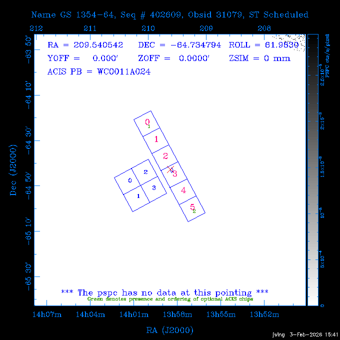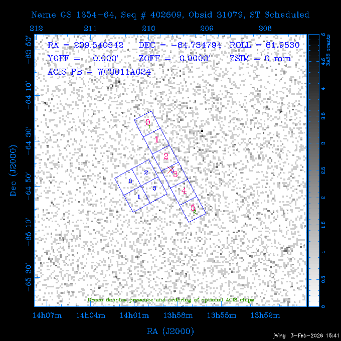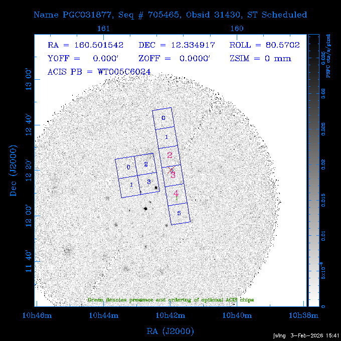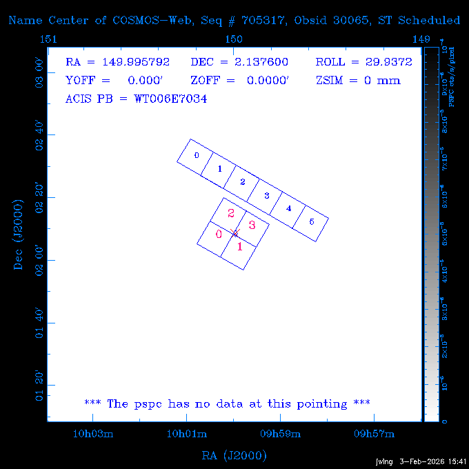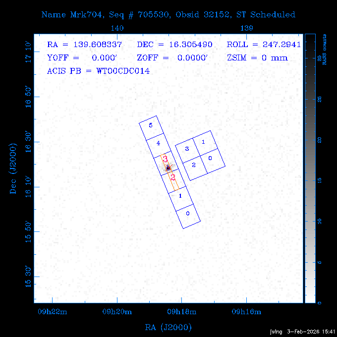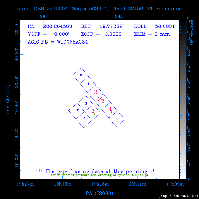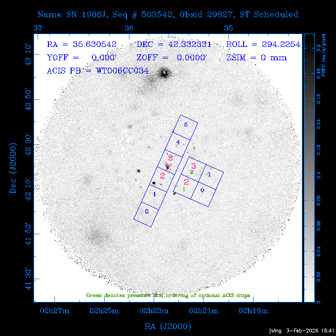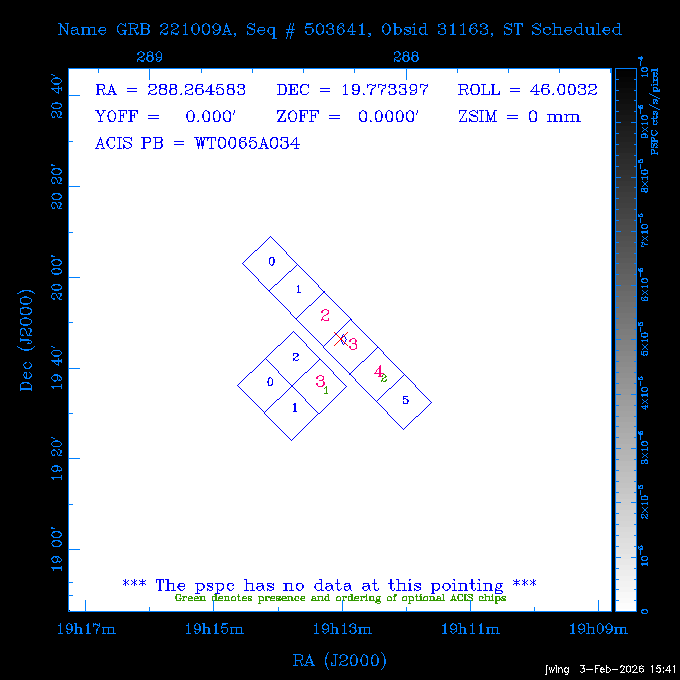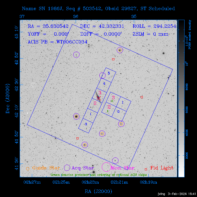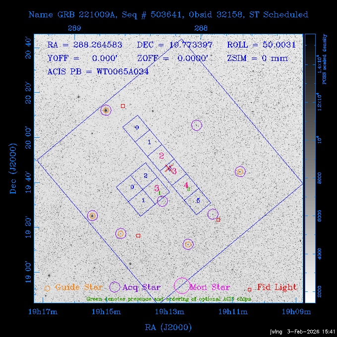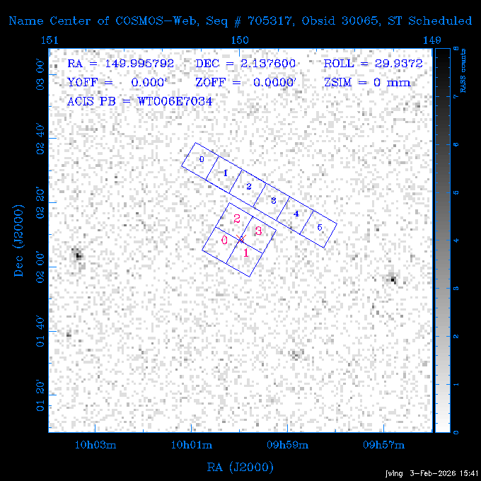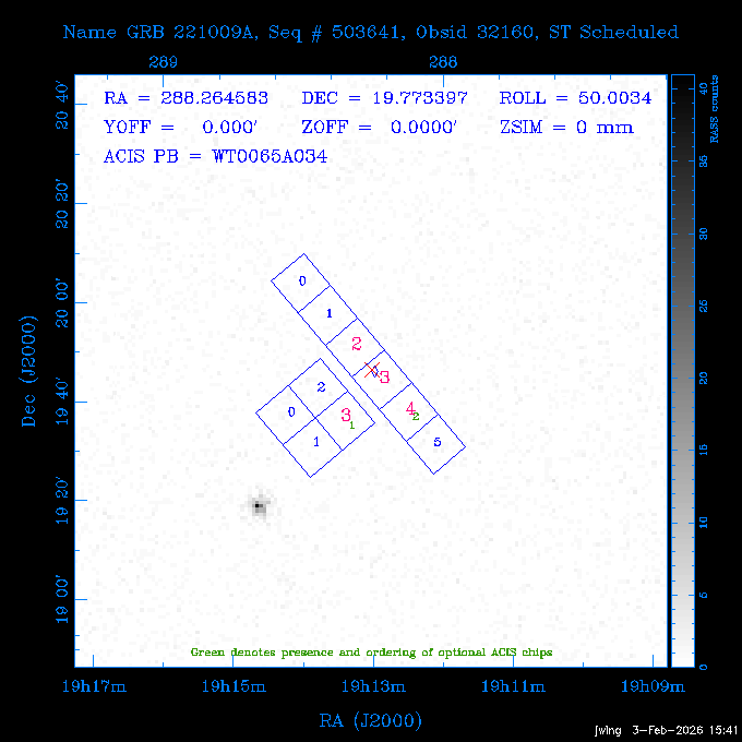 Seq # NB ObsID Constr. Target Start Time SI Grat Active Chips RA Dec Roll Pitch Slew Overlays ------ --- ----- ------- -------------------- --------------------- ----- ------ ---- ----------------- -------- -------- ------ ------ ------ ------------- 705466 P1 31431 0 PGC101434 2026:037:14:01:59.129 11.0 ACIS-S NONE S2,S3,S4 8.0775 15.0039 300.75 56.60 117.64 dss pspc rass 802203 32145 0 ZwCl 0857.9+2107 2026:037:17:46:55.469 10.0 ACIS-S NONE S1,S2,S3 135.1535 20.8945 221.87 172.94 117.48 dss pspc rass 705466 P1 32149 0 PGC101434 2026:037:21:15:11.921 11.0 ACIS-S NONE S2,S3,S4 8.0775 15.0039 300.84 56.30 117.48 dss pspc rass 802203 30399 0 ZwCl 0857.9+2107 2026:038:01:00:00.593 11.0 ACIS-S NONE S1,S2,S3 135.1535 20.8945 233.00 172.68 116.90 dss pspc rass 705305 32143 0 [vD2023]1 2026:038:04:41:37.288 18.0 ACIS-I NONE I0,I1,I2,I3 40.4405 -8.3506 284.16 78.13 102.50 dss pspc rass 802203 32146 0 ZwCl 0857.9+2107 2026:038:10:19:50.427 14.0 ACIS-S NONE S1,S2,S3 135.1535 20.8945 234.00 172.33 102.24 dss pspc rass 201908 CCT 32140 0 G 132-50 2026:038:14:50:13.255 4.8 ACIS-S NONE S2,S3 15.9179 40.8574 305.46 75.77 96.96 dss pspc rass 901886 30494 0 CMZ Molecular Cloud 2026:038:16:59:39.566 11.6 ACIS-I NONE I0,I1,I2,I3 266.5505 -28.8887 87.21 51.80 152.72 dss pspc rass 802268 CCT 32139 0 RMJ093723.8+125312.3 2026:038:20:56:06.721 11.0 ACIS-I NONE I0,I1,I2,I3 144.3494 12.8868 52.11 176.12 124.29 dss pspc rass 402609 TOO 31079 3 GS 1354-64 2026:039:00:36:06.074 30.0 ACIS-S HETG S0,S1,S2,S3,S4,S5 209.5405 -64.7348 61.99 85.17 95.20 dss pspc rass 705269 32141 0 BOSS1348 2026:039:09:31:54.177 7.6 ACIS-I NONE I0,I1,I2,I3 207.0600 23.9800 85.18 118.24 91.36 dss pspc rass ---- 41744 CAL-ER (PER07) 2026:039:12:08:42.683 2.0 -- -- 146.1000 14.3000 79.61 175.78 63.66 ---- 41743 CAL-ER (PER08) 2026:039:14:00:00.000 2.0 -- -- 136.0000 20.0000 229.12 172.49 146.69 ---- 41742 CAL-ER (CAL01) 2026:039:15:45:00.000 3.0 -- -- 354.2000 22.5000 316.91 49.01 123.52 ---- 41741 CAL-ER (PER04) 2026:039:19:29:47.109 5.5 -- -- 30.0000 43.0000 295.96 84.82 36.01 ---- 41740 CAL-ER (CAL01) 2026:039:22:00:00.000 1.0 -- -- 136.0000 20.0000 230.14 172.19 87.59 ---- 41739 CAL-ER (CAL01) 2026:039:23:15:00.000 1.0 -- -- 149.1622 13.0045 73.58 173.04 153.02 901886 32148 0 CMZ Molecular Cloud 2026:040:00:49:21.263 7.0 ACIS-I NONE I0,I1,I2,I3 266.5505 -28.8887 92.75 53.12 120.26 dss pspc rass 705317 30065 0 Center of COSMOS-Web 2026:040:03:27:08.811 17.8 ACIS-I NONE I0,I1,I2,I3 149.9958 2.1376 29.94 165.26 115.32 dss pspc rass 402579 29797 1 Cir X-1 2026:040:08:58:34.783 26.0 ACIS-S HETG S1,S2,S3,S4 230.1708 -57.1667 71.50 78.97 86.70 dss pspc rass 705317 32154 0 Center of COSMOS-Web 2026:040:16:46:39.624 21.0 ACIS-I NONE I0,I1,I2,I3 149.9958 2.1376 28.37 165.68 86.61 dss pspc rass 402579 32153 1 Cir X-1 2026:040:23:11:24.460 26.0 ACIS-S HETG S1,S2,S3,S4 230.1708 -57.1667 71.50 79.44 86.61 dss pspc rass 705465 P1 31430 0 PGC031877 2026:041:07:02:03.131 20.0 ACIS-S NONE S2,S3,S4 160.5015 12.3349 80.57 163.41 98.15 dss pspc rass ---- 41738 CAL-ER (IAT01) 2026:041:12:57:00.859 0.0 -- -- 202.6191 25.8899 89.70 124.07 47.76 503641 TOO 31163 2 GRB 221009A 2026:041:13:30:09.892 15.0 ACIS-S NONE I3,S2,S3,S4 288.2646 19.7734 46.00 48.91 77.85 dss pspc rass ---- 41737 CAL-ER (IAT02) 2026:041:18:04:35.439 0.0 -- -- 246.4208 -13.6333 78.57 74.92 60.42 503596 30850 1 G292.0+1.8 2026:041:18:36:10.730 30.7 ACIS-I NONE I0,I1,I2,I3 171.1485 -59.2657 26.92 103.19 70.82 dss pspc rass ---- 41736 CAL-ER (PER01) 2026:042:03:38:35.531 3.0 -- -- 147.5944 8.6723 29.17 173.69 71.82 ---- 41735 CAL-ER (PER04) 2026:042:08:13:30.000 3.0 -- -- 280.5514 -46.7293 116.80 49.07 124.97 ---- 41734 CAL-ER (PER06) 2026:042:09:38:57.848 0.9 -- -- 13.5770 -38.6554 254.10 49.49 89.84 ---- 41733 CAL-ER (PER05) 2026:042:10:26:35.403 3.0 -- -- 101.1745 -23.1614 306.83 123.45 73.99 ---- 41732 CAL-ER (PER07) 2026:042:12:55:00.000 0.9 -- -- 140.2847 12.1099 294.21 175.20 54.49 ---- 41731 CAL-ER (CAL01) 2026:042:13:53:23.862 0.9 -- -- 19.6933 -29.3676 265.49 52.73 122.46 ---- 41730 CAL-ER (PER08) 2026:042:14:50:41.816 2.0 -- -- 134.2000 12.1000 281.64 169.42 117.52 802196 30295 0 Perseus cluster 2026:042:16:09:25.354 55.0 ACIS-I NONE I0,I1,I2,I3,S2 49.9508 41.5117 283.80 95.57 87.42 dss pspc rass 705530 CCT 32152 0 Mrk704 2026:043:07:59:26.842 10.0 ACIS-S NONE S2,S3 139.6083 16.3055 247.30 173.68 80.36 dss pspc rass 802196 30298 0 Perseus cluster 2026:043:11:19:27.556 36.5 ACIS-I NONE I0,I1,I2,I3 49.9508 41.5117 284.14 94.82 80.30 dss pspc rass 705528 CCT 32150 0 SDSSJ093034.43+20441 2026:043:22:01:12.308 10.0 ACIS-S NONE S2,S3 142.6435 20.7380 205.81 172.11 80.61 dss pspc rass 802196 30302 0 Perseus cluster 2026:044:01:21:17.699 30.0 ACIS-I NONE I0,I1,I2,I3,S2 49.9508 41.5117 284.36 94.27 80.65 dss pspc rass 705529 CCT 32151 0 SDSSJ092313.77+15022 2026:044:10:15:19.584 15.0 ACIS-S NONE S2,S3 140.8074 15.0394 254.75 174.08 83.39 dss pspc rass 503542 29827 2 SN 1986J 2026:044:15:01:37.768 14.4 ACIS-S NONE I2,I3,S2,S3 35.6305 42.3323 294.25 83.97 93.61 dss pspc rass ---- 41729 CAL-ER (PER09) 2026:044:19:37:13.711 3.0 -- -- 140.7401 16.1830 245.39 173.25 91.21 ---- 41728 CAL-ER (PER11) 2026:044:21:00:12.538 3.0 -- -- 143.0104 7.9602 323.19 173.35 78.66 ---- 41727 CAL-ER (CAL01) 2026:044:22:33:35.663 0.9 -- -- 13.5770 -38.6554 251.17 48.16 125.48 ---- 41726 CAL-ER (PER10) 2026:045:02:00:00.000 3.0 -- -- 107.9000 -33.2000 314.30 120.32 72.99 ---- 41725 CAL-ER (CAL01) 2026:045:04:30:00.000 0.9 -- -- 143.0104 7.9602 320.70 173.25 53.02 ---- 41724 CAL-ER (CAL01) 2026:045:05:28:34.206 0.9 -- -- 20.3207 -28.5671 264.03 51.33 123.24 ---- 41723 CAL-ER (PER12) 2026:045:06:17:38.514 0.9 -- -- 303.5728 -58.0255 148.14 48.37 80.50 705307 30238 0 Center of COSMOS-Web 2026:045:07:27:21.984 18.0 ACIS-I NONE I0,I1,I2,I3 150.3376 2.2971 14.19 168.81 120.42 dss pspc rass ---- 41722 CAL-ER (IAT03) 2026:045:12:55:28.197 0.0 -- -- 204.1710 -4.0812 72.00 121.43 76.97 503641 TOO 32158 2 GRB 221009A 2026:045:1